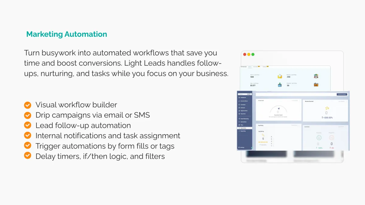 Automated Communication: Use SMS and email to follow up with leads and clients automatically.