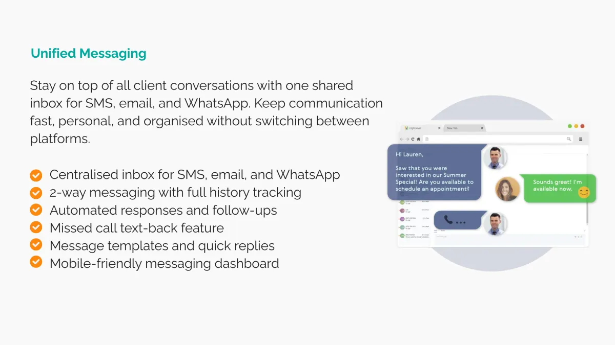 Stay on top of all client conversations with one shared inbox for SMS, email, and WhatsApp. Keep communication fast, personal, and organised without switching between platforms.