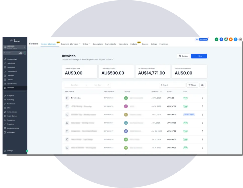 Get paid faster with simple automatic invoicing, integrated payments, and even membership features. Light Leads helps you manage the money side of your business with ease.